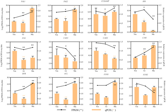 To verify the transcriptome data, 12 typical genes involved in flavonoid biosynthesis were chosen for expression analysis in Ym, Gi, and Ma by conducting qRT-PCR. The relative expression patterns of the majority of the candidate genes, as indicated in Figure 9, closely mirrored those observed in the transcriptome data obtained via Illumina sequencing. This congruence in expression patterns provides evidence supporting the validity and reliability of the transcriptome data.