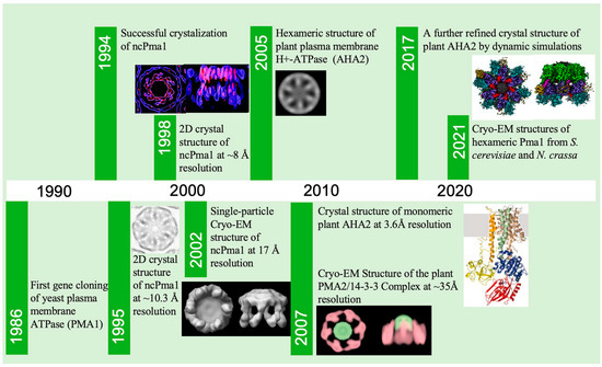 A timeline of landmark moments during plasma membrane H+-ATPase structure determination.