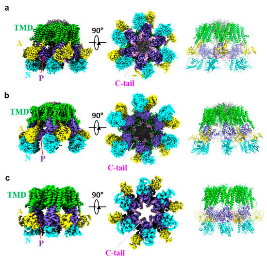 The plasma membrane H+-ATPase belongs to the P3A subfamily of P-type ATPases, which utilize ATP hydrolysis and phosphorylation to pump ions against the gradient through the cell membrane [12]. According to previous studies, P-type ATPases transport their substrate through a cyclic transition of E1–E1P–E2P–E2 states, known as the “Post–Albers” model. There are five main subclasses (P1 to P5) for P-type ATPases [13,14,15,16], each of which transports different substrates (cations or heavy metals for the P1, P2, and P3 ATPases; phospholipid molecules for the P4 ATPases [17]; polyamines or transmembrane helices for the P5 ATPases [18,19,20,21]). Like other P-type ATPases, Pma1 has a conserved architecture consisting of a transmembrane domain (TMD) and three large cytosolic domains: an actuator domain (A domain), a nucleotide-binding domain (N domain), and a phosphorylation domain (P domain) (Figure 1) [14]. Notably, the plasma membrane H+-ATPase is the only type of P-type ATPase that forms a hexamer; all other members function as a monomer or a heterodimeric complex with an additional regulatory subunit (Figure 1). The Pma1 hexamer has been reported in S. cerevisiae [22], N. crassa cells [23], and also in Kluyveromyces lactis [24]. The structural basis for hexameric Pma1 assembly and how it functions have long been unclear.