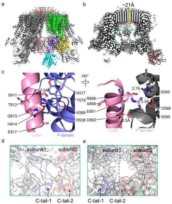 In the autoinhibited Pma1, the C-tail is ordered and mediates interactions with the two neighboring P domains (Figure 4c). Specifically, Ser911, His914, and Glu917 of the C-tail interact with Lys566, Asn577, Tyr579, and Arg583 of the P domain, while Arg898, Glu901, and Asp902 of the C-tail interact with Ser595′, Asp599′, and Arg625′ of the neighboring P domain [26]. Importantly, the C-tail was found to be disordered in the activated E2P state, indicating its important role in the activation of Pma1.