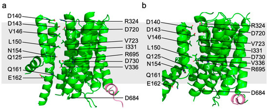 Structural comparison between Pma1 in the autoinhibited and activated states showed that the TMH3–10 of all Pma1 subunits and lipids in the central ring keep still while TMH1–2 move with respect to the remaining TMD region (Figure 5a,b). This indicates that the putative proton transport channel is between TMH1–2 and TMH3–10. The putative proton transport path can be divided into three groups of polar/charged residues: the top (extracellular) proton exit site (D140, D143, R324, and D720); the middle proton transport path in the membrane bilayer (R695 and D730); and the bottom (cytosolic) proton entry site (Q125, N154, Q161, and E162). Among these residues, D730, as the only acidic residue in the middle of the membrane, likely plays a central role in proton transport. Notably, the equivalent residue of D730 in AHA2 (D684) was shown to be essential for proton transport [50,51]. Pma1 mutations of D730 or R695 have been shown to reduce ATPase activity [52]. Furthermore, the three charged groups mentioned above are separated by two groups of hydrophobic residues: the upper group near the exoplasmic side contains V146, L150, I331, and V723, and the lower group near the cytosolic side contains V336.
