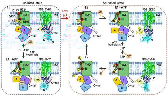 Two activated plasma membrane H+-ATPase structures have been reported thus far: the C-terminal truncated plant AHA2 in the E1-ATP state and the S. cerevisiae Pma1 in the active E2P state [25,26,33]. Combining these two structures and homology models of Pma1 based on other published P-type ATPase structures, we proposed a complete proton transport cycle of Pma1 (Figure 6). Firstly, Pma1 is activated from the autoinhibited state to the E1 state by relocation of the C-tail. D730 in the middle of the lipid bilayer is accessible from the cytosol and is protonated in a low pH environment. Then, ATP binding induces the movement of the N and A domains toward each other, while the P domain stays still (E1-ATP state). Accompanied with the movement of the A domain, TMH1–2 move downward and rotate slightly, and D730 is still accessible from the cytosol in this state. Subsequently, the D378 in the P domain of Pma1 is phosphorylated through the hydrolysis of ATP into ADP (E1P state). After releasing the ADP from the N domain, the conserved TGES motif in the A domain of Pma1 approaches the phosphorylation of D378 and catalyzes the dephosphorylation (E2P state). The rearrangement of the A domain and P domain from the E1P to E2P states also induces dramatic movement and rotation of TMH1–2. As a result, the D730 in the middle of the lipid bilayer is deprotonated and stabilized by a salt bridge with R695. The released proton is likely to be transferred to the D143 of the exoplasmic proton exit site. Then, the phosphate releases from the P domain and couples with the shifting back of TMH1–2 (E2). As in the inhibited state, D143 forms a salt bridge with R324 and is deprotonated. Finally, the proton diffuses to the exoplasmic side and the Pma1 changes to the E1 conformation for another reaction cycle.