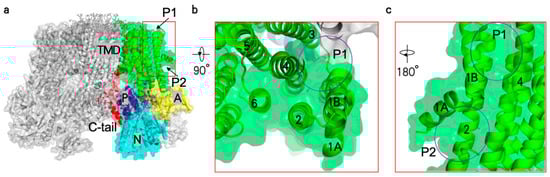 The two putative inhibitor binding pockets in Pma1. Pocket 1 (P1) and pocket 2 (P2), located at the extracellular leaflet and the intracellular leaflet of membrane, respectively (a). The major domains of Pma1 are labeled in different colors. Zoom-in views of the pockets are shown in (b,c). The positions of the pockets are highlighted by purple ovals. Numbers represent the serial numbers of the transmembrane helix.