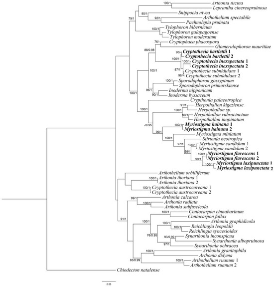 The combined sequence matrices revealed three new monophyletic lineages corresponding to three new species: Myriostigma flavescens J.X. Xue & Lu L. Zhang, sp. nov.; M. hainana J.X. Xue & Lu L. Zhang, sp. nov.; and M. laxipunctata J.X. Xue & Lu L. Zhang, sp. nov. All the species positions had strong support in the ML and Bayesian analyses. In our phylogenetic tree, we can see those three new species (M. flavescens, M. hainana and M. laxipunctata) are clustered with Myriostigma and Stirtonia. According to Aptroot [30], Stirtonia had transversely septate ascospores; thus, based on morphological characters and phylogenetic analysis, we propose three new species in Myriostigma. This is in addition to two new Chinese records, as both are clustered with Cryptothecia subnidulans (the type species of Cryptothecia), which supported the delimitation of two new Chinese records.
