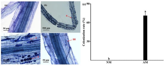 F. mosseae colonization of hemp roots and its effective colonization rate under a microscope before the start of treatment. Note: (a) NM-treated group; (b) spores (S) in the AM-treated group; (c) vesicles (V) in the AM-treated group; (d) intra-root hyphae (IH) in the AM-treated group; (e) AMF colonization rate of hemp root systems. Bar graphs represent means ± S.E. Different letters indicate significant differences between plants with and without AMF.
