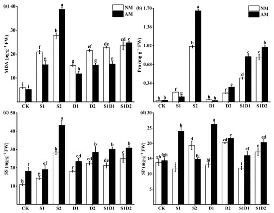 MDA (a), Pro (b), SS (c), and SP (d) content of hemp under salt and drought stress. Bars indicate mean ± S.E. Different letters indicate significant differences between hemp with and without AMF under each treatment.