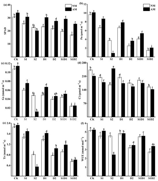 SPAD (a), Pn (b), Gs (c), Ci (d), Tr (e), and WUE (f) content of hemp under salt and drought stress. Bars indicate mean ± S.E. Different letters indicate significant differences between hemp with and without AMF under each treatment.
