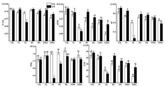 Fv/Fm (a), PS(II) (b), qP (c), NPQ (d), and ETR (e) content of hemp under salt and drought stresses. Bars indicate mean ± S.E. Different letters indicate significant differences between hemp with and without AMF under each treatment.