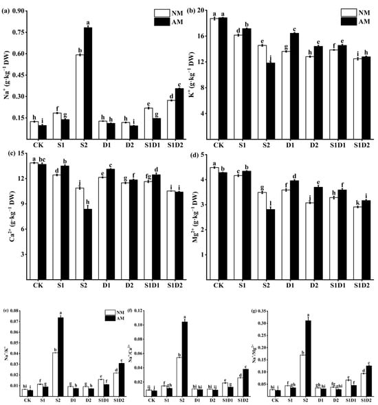 Na+ (a), K+ (b), Ca2+ (c), Mg2+ (d), Na+/K+ (e), Na+/Ca2+ (f), and Na+/Mg2+ (g) content of hemp leaves under salt and drought stress. Bars indicate mean ± S.E. Different letters indicate significant differences between hemp with and without AMF under each treatment.