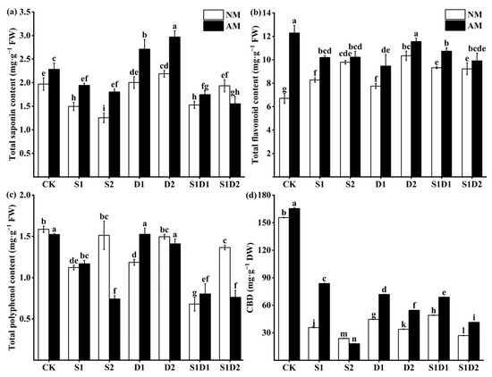 Total saponins (a), total flavonoids (b), total phenols (c), and CBD (d) content of hemp leaves under salt and drought stress. Bars indicate mean ± S.E. Different letters indicate significant differences between hemp with and without AMF under each treatment.