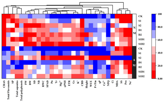 Heat map analysis of hemp inoculated with AMF, salt stress, and drought stress treatments. In the heat map, the color gradient sets bright red as the minimum, dark blue as the maximum, and white as the middle, with an asymptote (or gradient) between these endpoints.