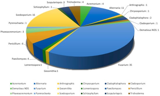 Pie chart showing the distribution of the species of fungi identified. Among them, Acremonium were 1 A. brunnescens, 1 A. strictum, 2 Acremonium sp.; Alternaria were 4 A. alternata, 1 A. infectoria, 6 Alternaria sp.; Arthrographis was A. kalrae; Cladophialophora were 2 C. bantiana; Fusarium were 2 F. dimerum, 7 F. fujikuroi, 2 F. moniliforme, 1 F. oxysporum, 1 F. petroliphilum, 5 F. proliferatum, 4 F. solani, 1 F. verticillioides and 12 Fusarium sp.; Geosmithia was G. argillacea; Lomentospora was L. prolificans; Paecilomyces were 1 P. variotii and 3 Paecilomyces sp.; Penicillium were 1 P. citrinum, 2 P. chrysogenum and 3 Penicillium sp; Phaeoacremonium were 1 P. fuscum and 2 Phaeoacremonium sp; Pyrenochaeta was P. romeroi; Scedosporium were 1 S. aurantiacum, 14 S. apiospermum, and 1 S. dehoogii; Schizophyllum was S. commune; Scopulariopsis were 1 S. brevicaulis, 1 S. gracilis and 1 Scopulariopsis sp; Trichoderma were 3 T. longibrachiatum and 1 Trichoderma sp.