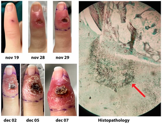 Fusarium solani acral invasive mold disease in a 20-year-old woman presenting with refractory AML, and neutropenia for one month. Photographs show a rapid local progression after a minor wound, in spite of the initiation of liposomal amphotericin B and terbinafine on 30 November 2022, after results of pus culture showing F. solani. After a switch to voriconazole and terbinafine on 7 December 2022, decision was made to amputate the finger, and histopathology Gomori methenamine silver staining shows numerous hyphae (red arrow). Finger culture grew F. solani. Blood cultures remained sterile and patient did well after amputation.
