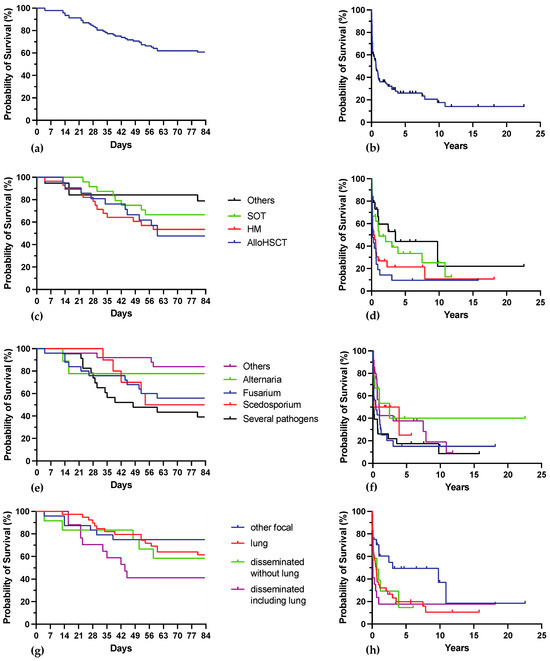 Kaplan-Meier estimates for survival. (a) shows 84-day survival for the whole cohort. (b) shows overall survival for the whole cohort. (c) shows 84-day survival according to main host factor. (d) shows overall survival according to main host factor. (e) shows 84-day survival according to the identified mold. (f) shows overall survival according to the identified mold. (g) shows 84-day survival according to IMD localization. (h) shows overall survival according to IMD localization.
