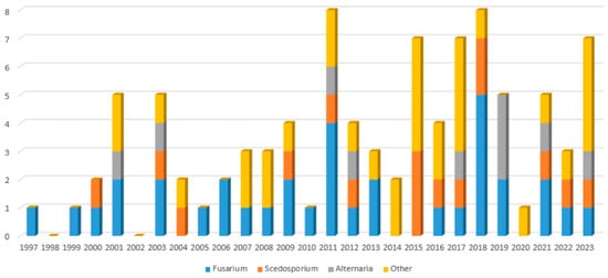 Data are scarce about diagnostics, management and outcome of these severe conditions. Several studies have however enhanced our knowledge by focusing on one pathogen, such as Fusarium [3,24,25], Scedosporium [4,26] or Alternaria [5]. Throughout this literature, we are faced with the fact that prognosis remains poor for these rare infections, and more data is awaited to better diagnose and treat the patients concerned. With this article, we try to bring in our contribution through the description of Fusarium, Scedosporium and other rare mold invasive infections having occurred in our tertiary-care center from 1997 to 2023.