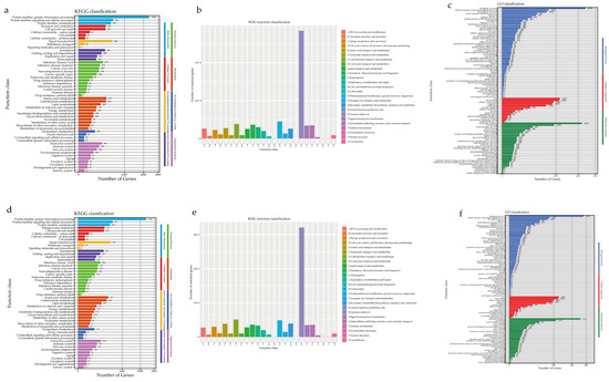 Functional annotation of Pe. elaphomyceticola and Pl. fusiformispora genes encoding the proteins. (a–c) Pe. elaphomyceticola (a) KEGG, (b) KOG, (c) GO; (d–f) Pl. fusiformispora (d) KEGG, (e) KOG, (f) GO).