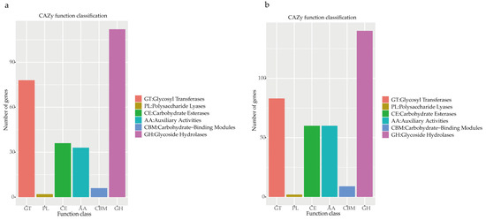 Enzymes that played an important role in carbohydrate modification, biosynthesis, and the degradation of fungi were carbohydrate-active enzymes (CAZy) [36], which are present in a database of carbohydrate-active enzymes and a special database of carbohydrate enzymes [37]. It was shown that Pe. elaphomyceticola (Figure 6a) and Pl. fusiformispora (Figure 6b) had many glycoside hydrolases (GHs), glycosyl transferases (GTs), and auxiliary activities (AAs), leading us to speculate that Pe. elaphomyceticola and Pl. fusiformispora possibly breakdown complex carbohydrates and capture more energy.