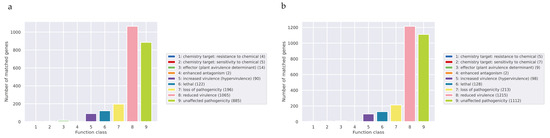 The full name of PHI is Pathogen Host Interactions Database, which is a database of pathogen–host interactions, mainly derived from fungi, oomycetes, and bacterial pathogens. The infected hosts include animals, plants, fungi, and insects [38]. This database plays an important role in searching for target genes for drug intervention, and it also includes antifungal compounds and corresponding target genes. The results showed that Pe. elaphomyceticola (Figure 7a) and Pl. fusiformispora (Figure 7b) had reduced virulence and the loss of pathogenicity genes. The primary annotated genes of Pe. elaphomyceticola and Pl. fusiformispora from the PHI database were used to reduce virulence and do not affect pathogenicity, indicating that Pe. elaphomyceticola and Pl. fusiformispora are not highly pathogenic strains.