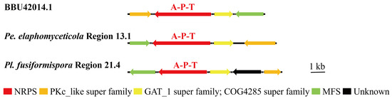 Comparison of putative BGC of ε-poly lysine in Pe. elaphomyceticola and Pl. fusiformispora. The number after the region and the number before the decimal point represent the scaffold, and the number after the decimal point represents the gene cluster.
