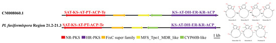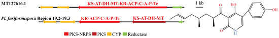 Comparison of biosynthesis of putative Tolypyridone in Pl. fusiformispora. The number after the region and the number before the decimal point represent the scaffold, and the number after the decimal point represents the gene cluster.