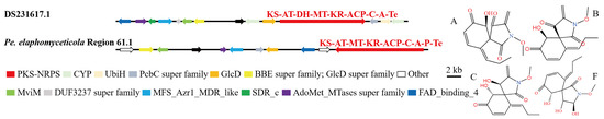 Several BGCs of Pe. elaphomyceticola and Pl. fusiformispora were 100% similar to MIBiG sequences. Purev et al. [39] found that ε-poly-lysine had antifungal activity. The predicted Pe. elaphomyceticola Region 13.1 and Pl. fusiformispora Region 21.4 were responsible for ε-poly-lysine (Figure 8). The local BLAST comparison demonstrated that ε-poly-lysinehas requires enzymes with the A-P-T structural domain, PKc-like super family, GAT_1 super family, and MFS. Both species have the potential to synthesize ε-poly-lysinehas. Zhang et al. [40] studied genome mining of in-house strains using hybrid PKS–NRPS as a query and identified an endophyte Tolypocladium sp. 49Y, which possesses a potential 4-hydroxy pyridone biosynthetic gene cluster. Moreover, heterologous expression in Aspergillus oryzae NSAR1 revealed that this gene cluster was functional and able to produce a rare type of 4-hydroxy pyridones called Tolypyridone. The predicted Region 19.2 and Region 19.3 of Pl. fusiformispora might be responsible for Tolypyridone biosynthesis (Figure 9). Qin et al. [41] proved that Monorden D/monocillin IV/monocillin VII/pochonin M/monocillin V/monocillin II compounds have modest antibacterial activities. By comparison, Pl. fusiformispora Region 21.2 and Region 21.3 had highly homologous regions, being highly similar to the synthetic Monorden D/monocillin IV/monocillin VII/pochonin M/monocillin V/monocillin II gene cluster (Figure 10). These results indicated that the catalytic synthesis of NR-PKS (SAT-KS-AT-PT-ACP-Te), HR-PKS (KS-AT-DH-ER-KR-ACP), FixC super family, MFS_Tpol_MDR_like, and CYP60B-like were necessary genes. The results showed that (Figure 11) Pe. elaphomyceticola Region 61.1 was like the gene cluster DS231617.1 that catalyzed the synthesis of Triticone ABFC. However, Pl. fusiformispora did not have the cluster of Triticone ABFC. Pe. elaphomyceticola Region 9.1 was highly similar to the known gene cluster that catalyzed the synthesis of piperazine (Figure 12). The slight difference was that one gene in Pe. elaphomyceticola Region 9.1 had dehydrogenase and CYP503A1-like functions. Moreover, KJ728786.1 synthesized 4-epi-15-epi-brefeldin A (Figure 13). The core gene structural domain (KS-AT-ER-KR-ACP) in Pl. fusiformispora Region 68.1 was similar to KJ728786.1. However, Pl. fusiformispora lost some of its modified genes during evolution. It was speculated that the position direction of key enzymes and modified genes was different when different genera were in the compound. At the same time, there will be gene fusion and gene loss in the process of evolution.
