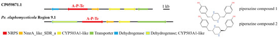 Comparison of biosynthesis of putative piperazine compound 1 and piperazine compound 2 in Pe. elaphomyceticola. The number after the region and the number before the decimal point represent the scaffold, and the number after the decimal point represents the gene cluster.
