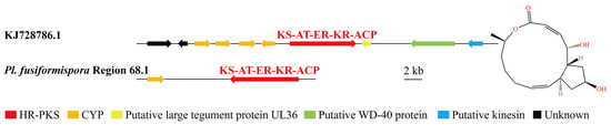 Brefeldin A is a unique fungal metabolite of a 13-membered macrocyclic lactone ring [55] and shows a wide range of interesting biological activities, including an inhibitory effect on virus multiplication [56,57]. Zabala et al. [58] found that HR-PKSs (KS-AT-DH-ER-KR-ACP) were the key enzymes catalyzing Brefeldin A (BFA). Similar homologous Regions 68.1 of Pl. fusiformispora were also present in both the antiSMASH and local BLAST analyses. Only the CYP-modified gene was present, and the other modified genes were lost. Consequently, Pl. fusiformispora might produce Brefeldin A (BFA) compounds. The presence of this compound in Pl. fusiformispora requires further investigation of its functionality.