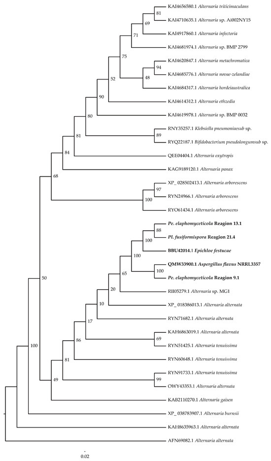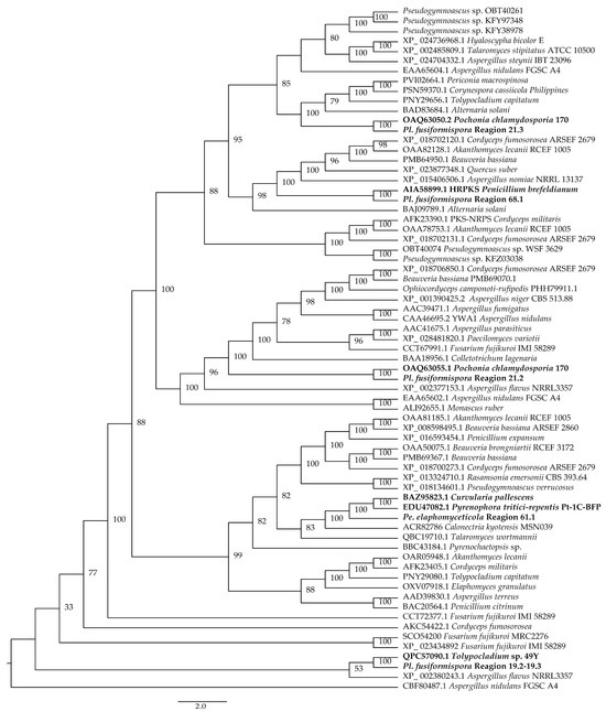 Clustering tree of hybrid PKS–NRPS proteins between Pe. elaphomyceticola and Pl. fusiformispora species and other fungi. Values at the nodes represent bootstrap values. Bold lines are shown at the nodes for 100 support. The scale bar 2.0 indicates the number of expected mutations per site. Bold indicates their clustering situation.
