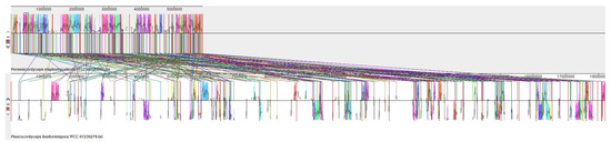 The scaffolds containing the SM BGC in the genomes of Pe. elaphomyceticola (39) and Pl. fusiformispora (50) were subjected to synteny analysis. The scaffolds where the SM BGC are located are divided into more than 10 collinear blocks, and there may be rearrangement (Figure 16). From bottom to top, they are Pl. fusiformispora and Pe. elaphomyceticola, respectively.