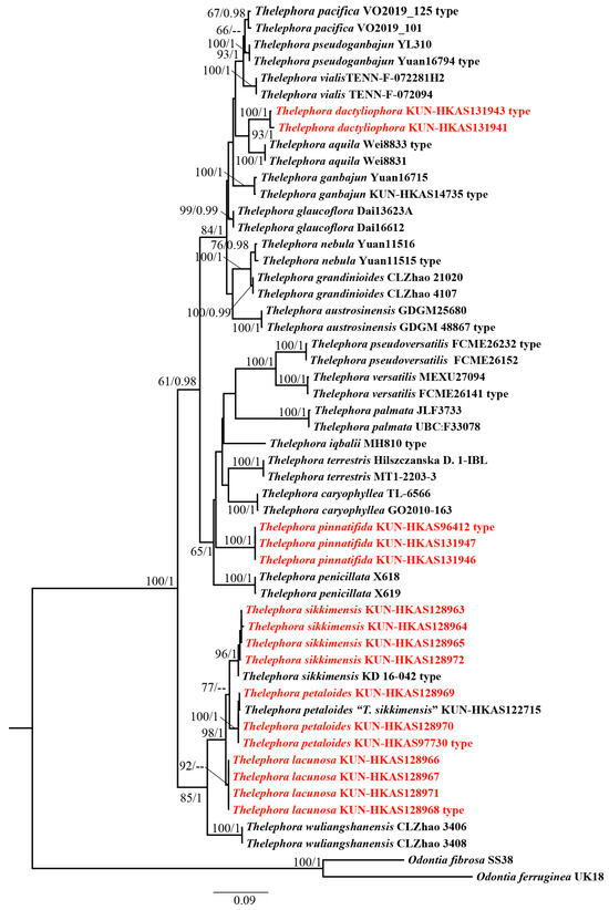 Phylogenetic relationships between species of Thelelphora inferred from ITS dataset using the Maximum Likelihood and Bayesian inference approaches (ML topology is shown). ML bootstrap support (≥50) and Bayesian posterior probability (≥0.95) are shown at the branches (BS/PP). Sequences newly generated in this study are highlighted in red. Vouchers are indicated after the species names. Odontia fibrosa and O. ferruginea were used as the outgroup taxa.