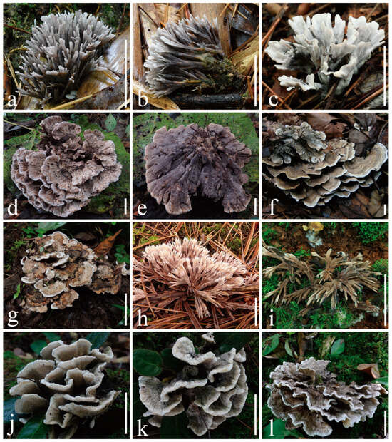 Fresh basidiomes. (a–c) Thelephora dactyliophora ((a,b) from KUN-HKAS131943, type; (c) from KUN-HKAS131941); (d,e) Thelephora lacunosa (KUN-HKAS128968, type); (f,g) Thelephora petaloides ((f) from KUN-HKAS97730, type; (g) from KUN-HKAS128969); (h,i) Thelephora pinnatifida ((h) from KUN-HKAS96412, type; (i) from KUN-HKAS131946); (j–l) Thelephora sikkimensis ((j,k) from KUN-HKAS128965, type; (l) from KUN-HKAS69236). Bars = 20 mm.