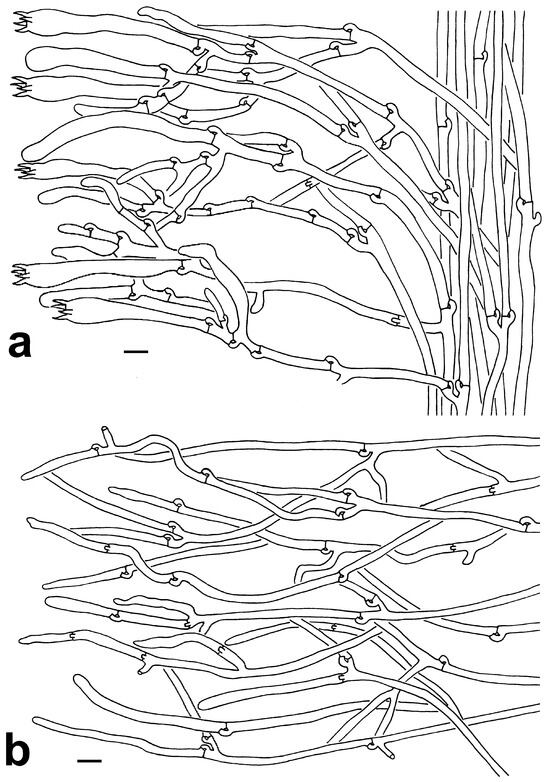 Microscopic features of T. dactyliophora (KUN-HKAS131943, type). (a) Hymenium and subhymenium. (b) Pileipellis. Bars = 10 µm.