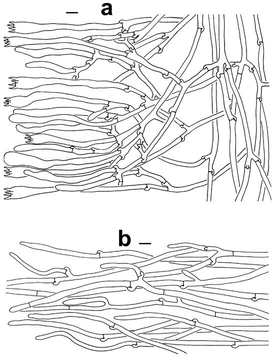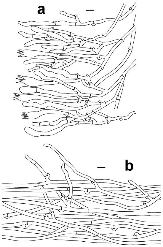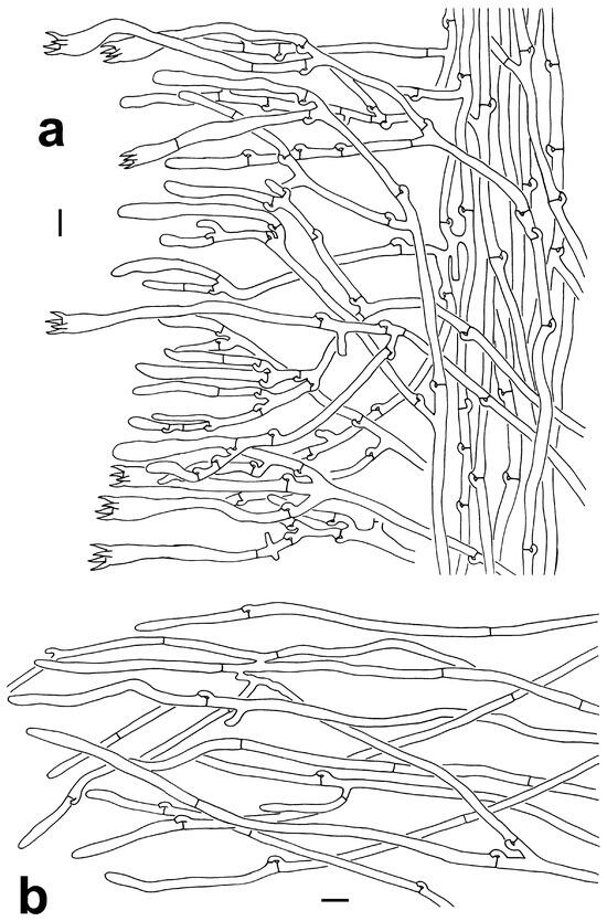 Microscopic features of T. pinnatifida (KUN-HKAS96412, type). (a) Hymenium and subhymenium. (b) Hair-like appendages of pointed tips. Bars = 10 µm.