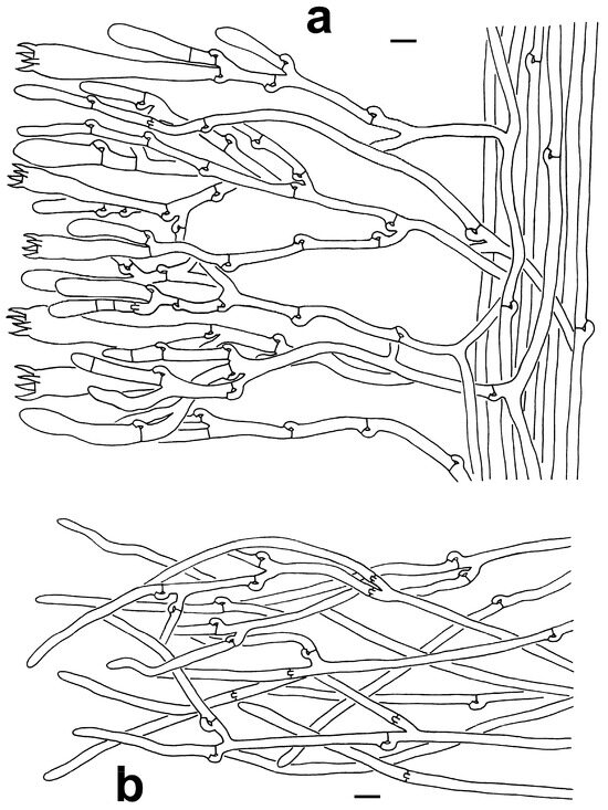 Microscopic features of T. sikkimensis (KUN-HKAS128965, type). (a) Hymenium and subhymenium. (b) Pileipellis. Bars = 10 µm.