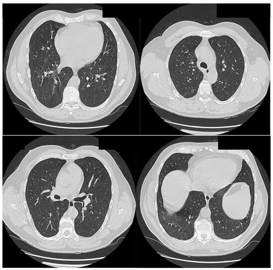 A 50-year-old male patient from a rural area, known to have common B-cell acute lymphoblastic leukemia, was admitted to the Infectious Diseases Department of Bihor County Clinical Hospital, Romania, on 13 August 2022, with a diagnosis of COVID-19 presenting with fever, and received treatment as a result. The patient underwent previous prophylactic antifungal treatment with fluconazole. Chest computed tomography (CT) revealed a fine fibrous band in the right posterior basal region, Figure 1. The paraclinical investigations conducted are presented in Table S1. Treatment was initiated with anti-viral (molnupiravir, for 5 days), corticosteroid (dexamethasone, for 10 days), antibiotics (meropenem, linezolid), for 10 days, platelet transfusion, antipyretics, and antifungal medications (fluconazole) for 14 days.