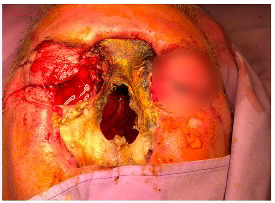 An 84-year-old female patient from an urban environment, known to have insulin-dependent type 2 diabetes mellitus, was admitted in August 2023 to the Ear, Nose and Throat (ENT) Department of the Bihor County Clinical Hospital, Romania, presenting with headache and swelling of the right eyelid. It is noteworthy that three weeks ago, the patient had a SARS-CoV-2 infection, which was managed at home (including moxifloxacin and dexamethasone, both for 10 days). On physical examination, she presented with necrosis of the mucosa and inferior nasal turbinate on the right side, with occasionally bloody and foul-smelling mucopurulent secretions, purulent endophthalmitis of the right eye, right eye blindness, and onychomycosis. A cranial CT scan revealed left orbital cellulitis with endophthalmitis, right pansinusitis with frontal, sphenoidal, and posterior ethmoidal collections, and adjacent bone lysis, Figure 5. Macroscopic histopathological examination revealed a black, foul-smelling crust lining the pituitary mucosa. The microscopic examination showed fragments with necrosis, inflammation, and hyphae in the form of thick ribbons measuring 10–20 microns, some of which were elongated. The microscopic appearance is suggestive of mucormycosis, Figure 6. Surgical treatment was initiated with the excision of necrotic tissues, antifungal therapy (posaconazole), hemostatics, and insulin. At the time of treatment, amphotericin B and isavuconazole were unavailable in the hospital. Laboratory tests showed elevated transaminases, prompting the addition of hepatoprotective agents, Table S2. The subsequent clinical course was favorable with posaconazole (for 6 weeks).
