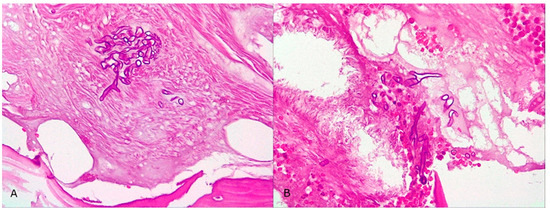 Microscopic examination of the biopsy specimen (400× magnification). (A,B) Multiple histological sections represented by necrotic-inflammatory material, with numerous bacterial colonies and fungal filaments, some branching at a 90-degree angle, consistent with mucormycosis.