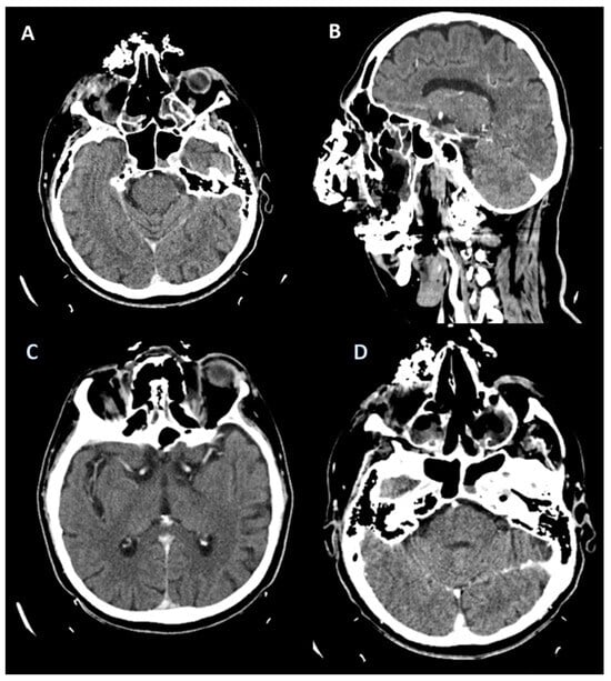 Cranial CT (scale bar equals 1.25 mm). (A,B) The image of the coronal computed tomography shows thickening of the mucosa and homogeneously walled-off collections with air inclusions, localized in the left sphenoidal sinus, bilateral frontal maxillary sinuses, and ethmoidal cells, post-necrotic bone structure changes with the interruption of the bone cortex, and multiple osteolytic lesions in the bilateral fronto–ethmoido–maxillary regions, as well as in the nasal septum and nasal bones. (C,D) Right eyeball with reduced dimensions and altered structure with a shrunken appearance.