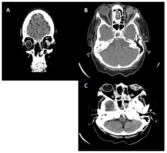 Cranial CT. (A) (scale bar equals 1.25 mm). Left ocular globe with loss of sphericity, reduced dimensions, and heterogeneous hyperdense appearance of the vitreous body with subcorneal and subscleral air infiltrates. (B,C) Thickening of the mucosa of the right maxillary sinus with lysis of the postero-superior wall, as well as the posterior right ethmoid with a collection showing fluid and parafluid densities at that level, with an iodophilic wall communicating with another collection with the same characteristics in the projection of the right sphenoid, which presents lysis of the anterior wall, lysis of the anterior ethmoid cells, and the nasal bones on the right side, as well as a collection in the right frontal sinus.