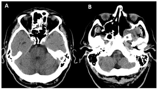 Cranial CT. (A,B) (scale bar equals 1.25 mm). Parafluid collection at the level of the left maxilla with osteolysis of the anterior, medial, and posterior walls; a similar aspect was observed at the level of the left sphenoidal sinus in its basal portion with osteolysis of the antero-inferior wall. Minimal thickening of the mucosa of the left frontal sinus and left ethmoidal cells, with the absence of the left nasal turbinate.