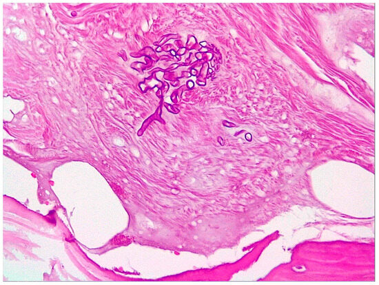 A 63-year-old male patient from a rural area was admitted to the ENT Department of Bihor County Clinical Hospital, Romania, in January 2022, complaining of headache, swelling of the left half of the face, and mucopurulent rhinorrhea. On physical examination, extensive necrosis of the left nasal cavity mucosa with black crusts and yellow-blackish secretions and a complete absence of the middle nasal turbinate were noted. The patient had a history of SARS-CoV-2 infection two months before onset (untreated with corticotherapy or antibiotics). A cranial CT scan revealed left pansinusitis with an extension of the inflammatory process to the left pterygoid musculature, Figure 7. Microscopic histopathological examination revealed non-septate hyphae angled at 90 degrees, along with areas of chronic inflammation and bacterial colonies, Figure 8. Periodic Acid-Schiff staining highlighted these hyphae, which were interpreted as mucormycosis. Surgical treatment was initiated with the debridement of necrotic areas, antifungal therapy (amphotericin B for 3 weeks), antibiotics (vancomycin, ciprofloxacin, both for 2 weeks), and analgesics, with favorable progress. On the 8th day of treatment, the patient developed acute renal failure (creatinine 4.98 mg/dL), prompting the discontinuation of vancomycin therapy to reduce nephrotoxicity, with subsequent favorable evolution and creatinine decreasing to 1.56 mg/dL, Table S3.