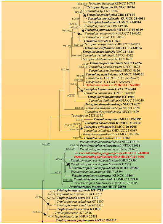 Tetraplosphaeriaceae was introduced by Tanaka et al. [1] to accommodate five tetraploa-like genera, viz., Polyplosphaeri, Pseudotetraploa, Quadricrura, Tetraplosphaeria (type), and Triplosphaeria. In a reassessment conducted by Hyde et al. [2], Tetraplosphaeria was treated as a synonym of Tetraploa, which had previously been applied to the asexual state. Therefore, Tetraploa now represents the type of the family. Subsequently, Ariyawansa et al. [3] and Dong et al. [4] incorporated Shrungabeeja and Ernakulamia into their phylogenetic analyses. Based on morphological similarities and molecular characteristics, the inclusion of these two genera in the family is widely accepted [5,6,7,8]. According to the “Outline of Fungi and fungus-like taxa—2021”, a total of nine genera have been listed within the family, viz., Aquatisphaeria, Byssolophis, Ernakulamia, Polyplosphaeria, Pseudotetraploa, Quadricrura, Shrungabeej, Tetraploa, and Triplosphaeria [9]. Recently, Zhang et al. [10] introduced one additional new genus, Pseudopolyplosphaeria, which was collected from karst landscapes of Guizhou Province on dead bamboo culms. Hyde et al. [2] and Dong et al. [4] have provided a taxonomic key for several genera within Tetraplosphaeriaceae. Tetraplosphaeriaceae is characterized by massarina-like sexual morphs with almost hyaline, 1(–3)-septate ascospores and/or tetraploa-like asexual morphs with several setose appendages [1]. The majority of species within the family have been recorded as saprobic, primarily associated with bamboo [1,11,12]. Additionally, some species have also been found to inhabit aquatic environments [4,5,7,8,13].
