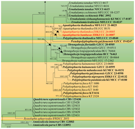 The combined sequence alignments comprised 98 taxa (Table 1) with Amniculicola immersa CBS 123083 and Amniculicola parva CBS 123092 as the outgroup taxa [7]. The dataset comprised 4514 characters including alignment gaps (LSU, ITS, SSU, tub2, and rpb2 sequence data). The RAxML analysis of the combined dataset yielded a best scoring tree with a final ML optimization likelihood value of -26757.620769. The matrix had 1662 distinct alignment patterns, with 50.02% undetermined characters or gaps. The estimated base frequencies were as follows: A = 0.243853, C = 0.250309, G = 0.276052, and T = 0.229786; substitution rates were AC = 2.252767, AG = 4.258052, AT = 1.766702, CG = 1.384778, CT = 8.963127, and GT = 1.000000; the gamma distribution shape parameter was α = 0.549203. Bayesian posterior probabilities from Bayesian inference analysis were assessed with a final average standard deviation of split frequencies = 0.010798. In the phylogenetic tree (Figure 1), our new collections ZHKUCC 24-0005 and ZHKUCC 24-0007 cluster within Aquatisphaeria, while ZHKUCC 24-0006 and ZHKUCC 24-0008 are nested within Pseudotetraploa. In addition, ZHKUCC 24-0009 is grouped within Tetraploa.