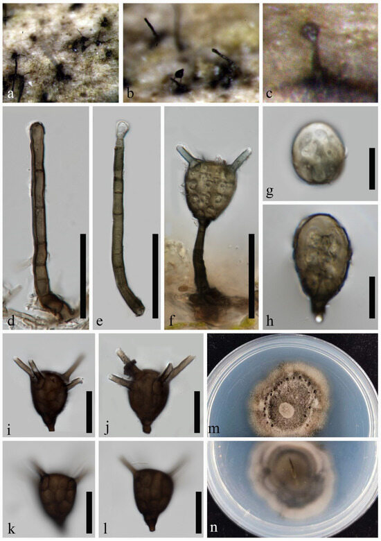 Aquatisphaeria thailandica (MHZU 24-0005). (a–c) Colonies on natural substratum. (d–f) Conidiophores, conidiogenous cells and conidia. (g–l) Conidia. (m,n) Colonies on PDA (front and reverse). Scale bars: (d–f) = 50 µm, (g–l) = 20 µm.