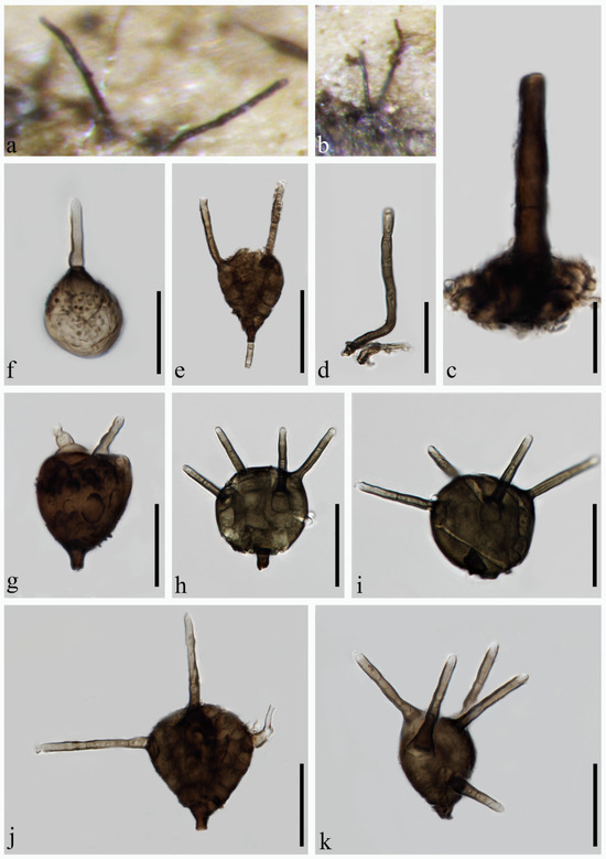 Aquatisphaeria bambusae (MHZU 24-0007, holotype). (a,b) Colonies on natural substratum. (c–e) Conidiophores, conidiogenous cells and conidia. (f–k) Conidia. Scale bars: (c,d) = 50 µm, (e–k) = 20 µm.