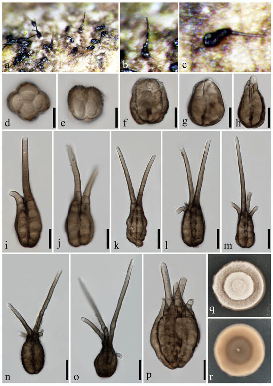 Pseudotetraploa yangjiangensis (MHZU 24-0008, holotype). (a–c) Colonies on natural substratum. (d–p) Conidia. (q,r) Colonies on PDA (front and reverse). Scale bars: (d–p) = 10 µm.