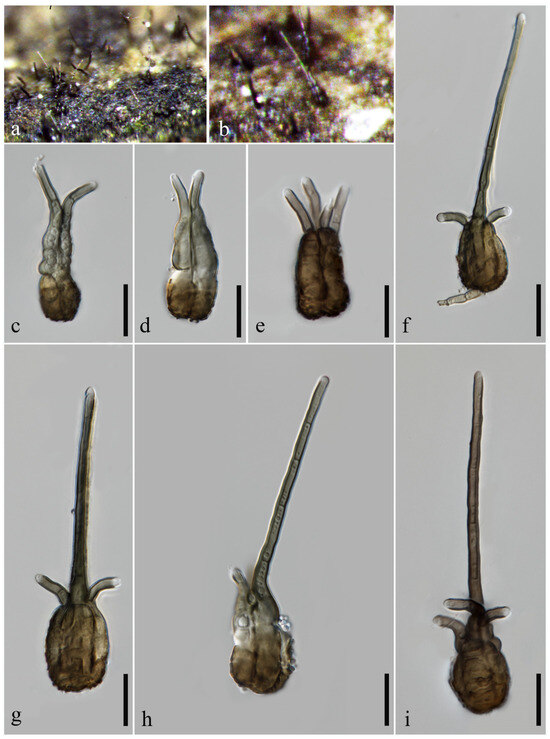 Pseudotetraploa phyllostachydis (MHZU 24-0006, holotype). (a,b) Colonies on natural substratum. (c–i) Conidia. Scale bars: (c–i) = 20 µm.