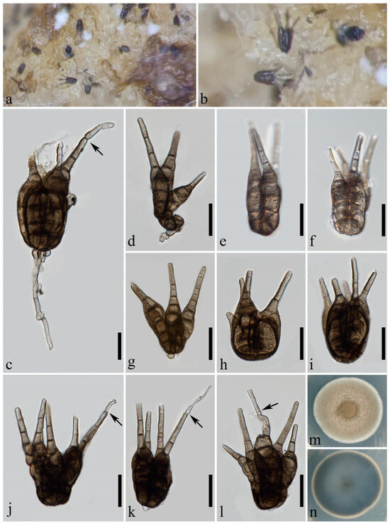 Tetraploa submersa (MHZU 24-0009, holotype). (a,b) Colonies on natural substratum. (c–l) Conidia (arrows indicate the ongoing growth of appendages). (m,n) Colonies on PDA (front and reverse). Scale bars: (c–l) = 20 µm.