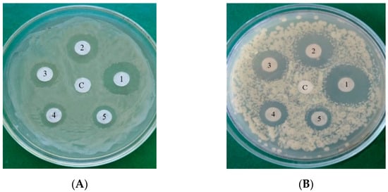 Figure 3. Inhibitory effect of LysOx on the growth of B. subtilis VKM B-720 (A) and of E. durans VKM B-603 (B). 1—5 U; 2—2.5 U; 3—1.25 U; 4—0.5 U; 5—0.25 U; C—control.