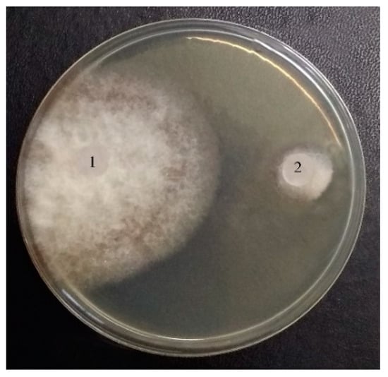 Figure 4. The influence of LysOx on the growth of R. solani VKM F-895. 1—without LysOx (control), 2—with LysOx (5 E).